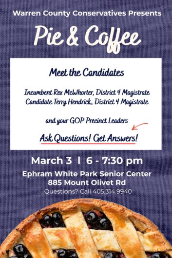 Come enjoy homemade pie, fresh coffee, and a relaxed opportunity to meet and hear from your Republican Party Precinct leaders and our Warren County District 4* Magisterial candidates:
